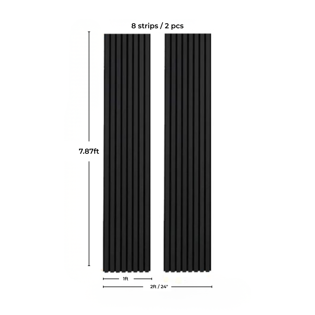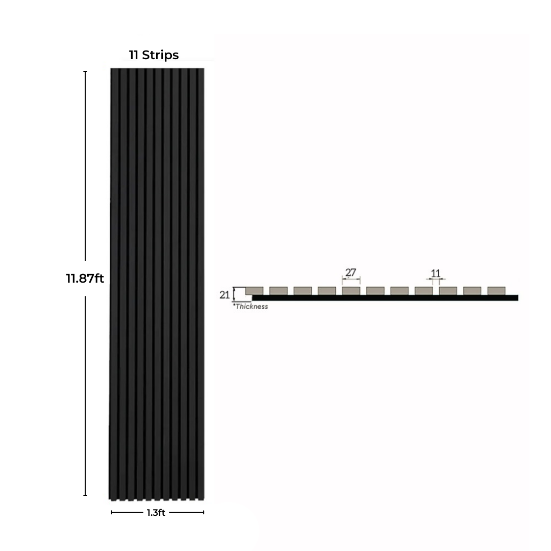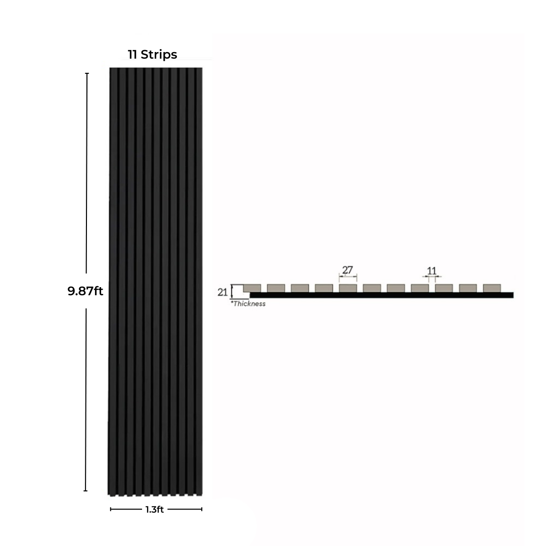The Black Acoustic Slat Wood Panels sleek black finish gives any room a striking, contemporary vibe while lowering echo and improving acoustics. The charcoal wood finish on these gorgeous black slatted panels is soft and luxurious. Black felt backing with grey undertones and black slats. These contemporary, simple-to-install wood slat wall panels will add some on-trend drama to your room. The acoustic slat color wall panel series is a wonderfully designed strip ornamental wall and ceiling panel that has excellent acoustic qualities. The space between each slat is 10mm and it has 21mm thickness.